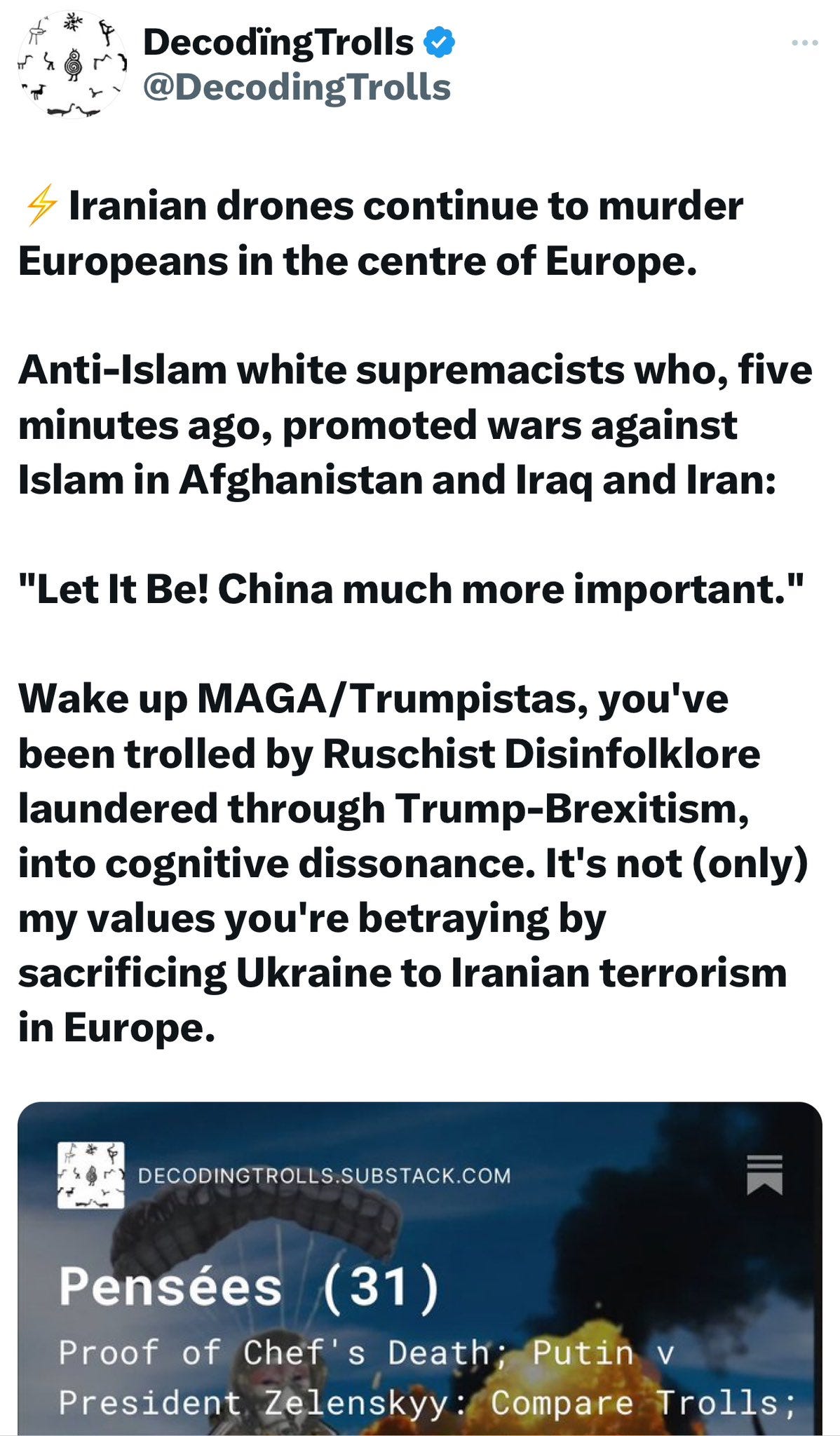 Note the range of Iran’s drones reaches well into Central Europe, where there are many soft military targets including US bases. Not clear Donald has thought this through, or how effectively Iran, Russia and China’s TikTok will be able to stir the same kinetic civil war inside America that Donald himself is stoking.