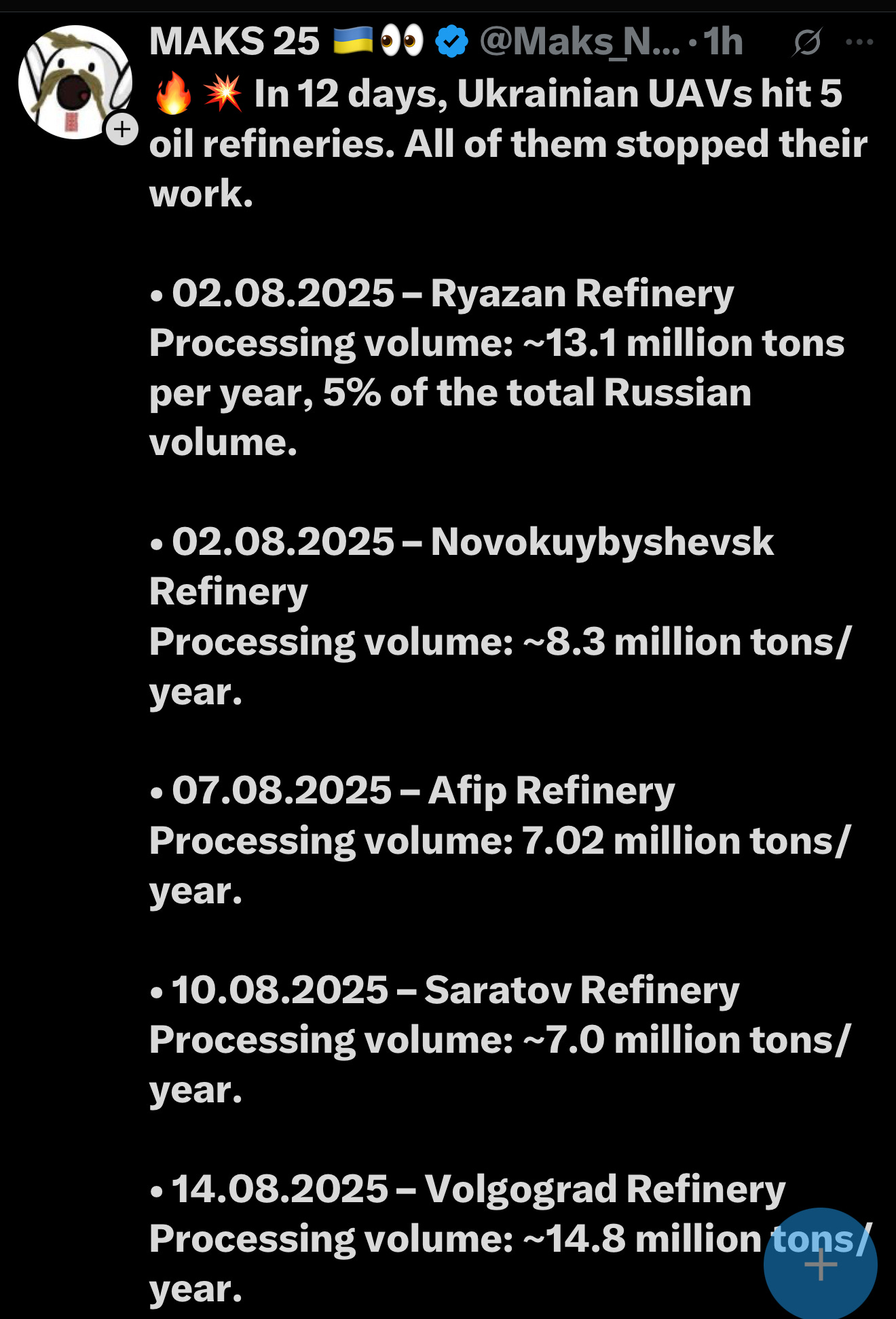 Just in the past ten days Ukraine has devastated Ruschia’s oil industry in a way no power on earth between 1945-1990 dreamed was possible to USSR.