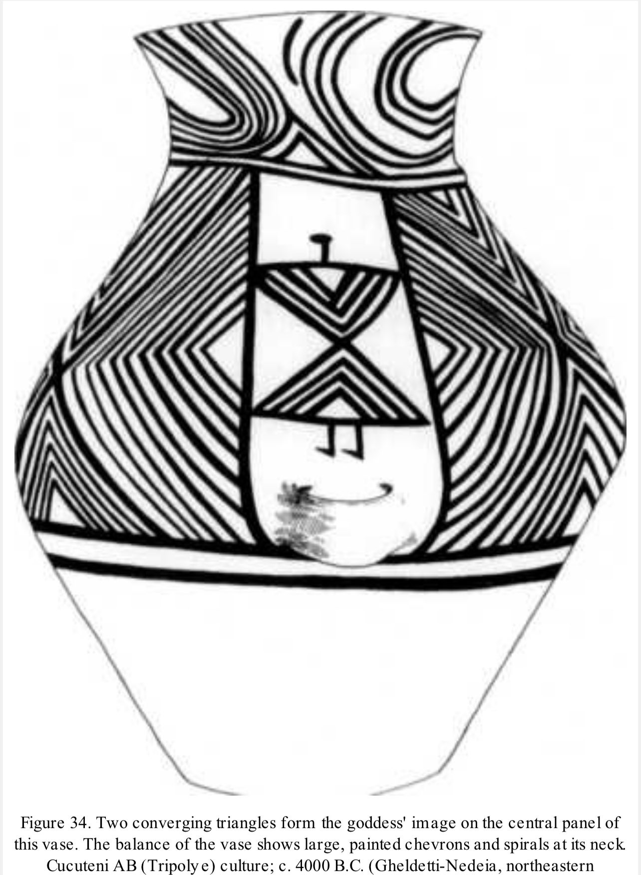This hourglass- shaped goddess frequently occurs in vase paintings from the Cucuteni (Tripoly e) culture in Ancient Ukraine, dating from 4500 to 3000 B.C.