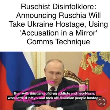 First, that they were being "held hostage" by their leaders - in reality, unlike in Russia, Ukrainians elect their leaders, right down to village level. Genocide Lawyers call this "Accusation in a Mirror" - Genocide "perpetrator accuses the targeted group of planning, or having committed, atrocities like those the speaker envisions against them, framing the putative victims as an existential threat and making violence against them seem defensive and necessary." Ruschia planned to hold Ukraine, Ukrainians, and indeed all of Europe hostage to nuclear blackmail.