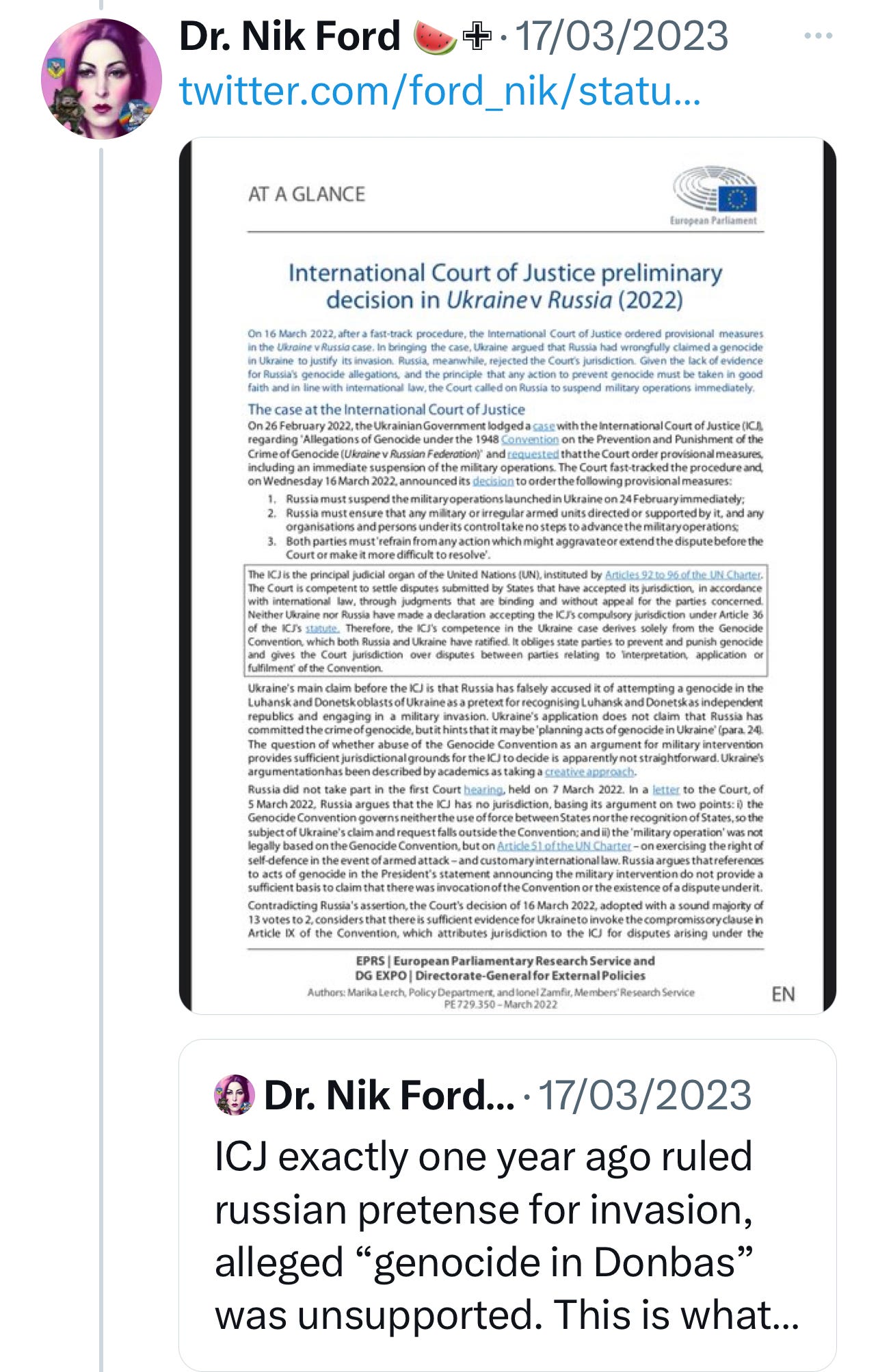 International Court of Justice ruled in March 2022 that russian pretence for invasion, alleged “genocide in Donbas” was unsupported.