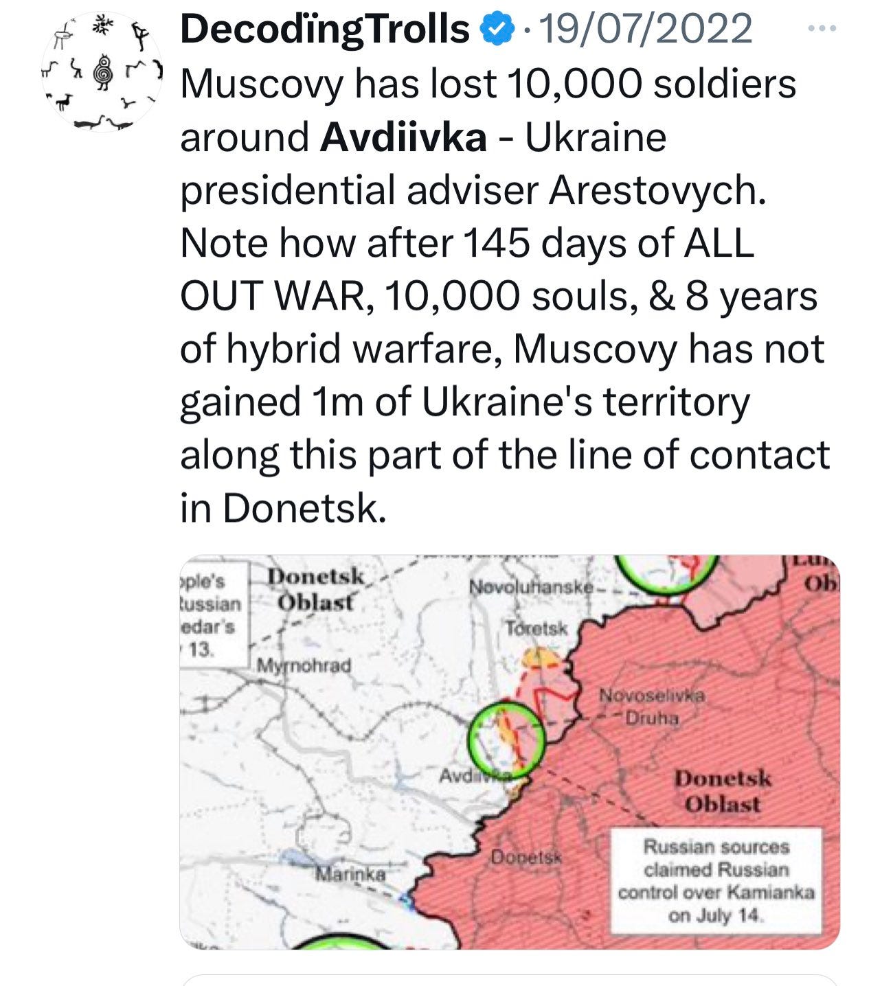 By June 2022 Ruschia had lost 10,000 Ruschist souls (RIP) attempting to seize Avdiivka.