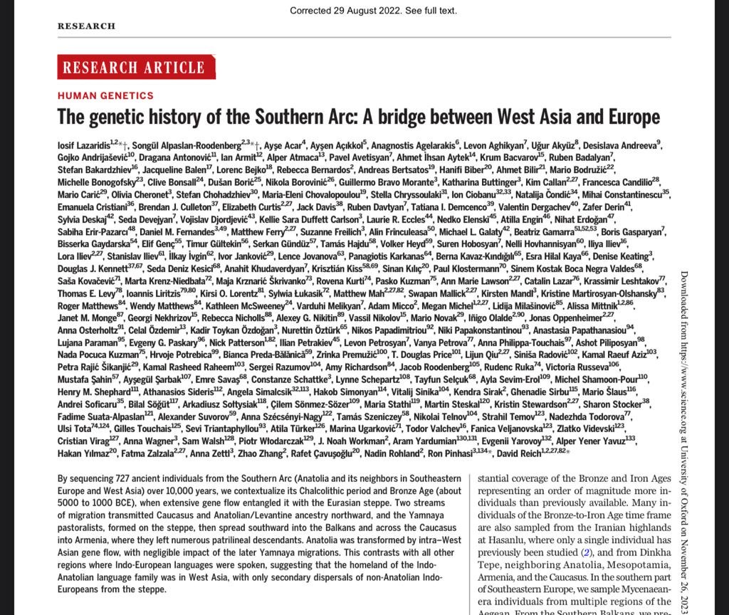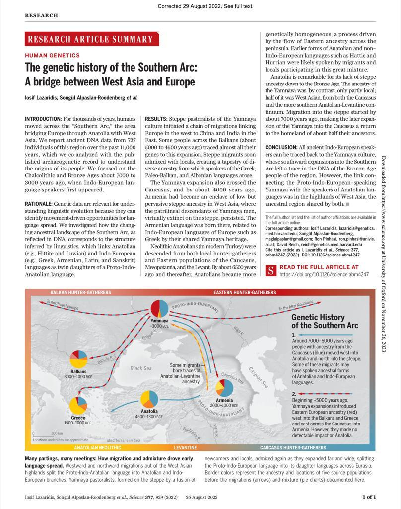 “All ancient Indo-European speakers can be traced back to the Yamnaya culture, whose southward expansions into the Southern Arc left a trace in the DNA of the Bronze Age people of the region. However, the link connecting the Proto-Indo-European–speaking Yamnaya with the speakers of Anatolian languages was in the highlands of West Asia, the ancestral region shared by both.