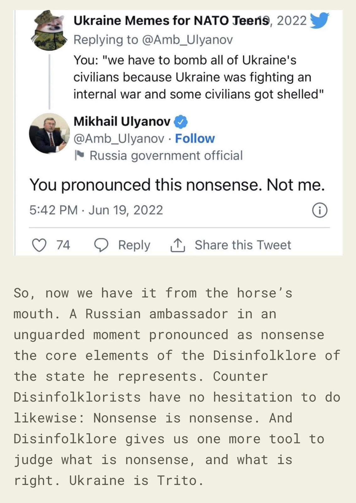 P.S. Joke is definitely on this particular Ruschist Nazi, as it was he who, when his Disinfolklore was reflected back at him by LivFaustDieJung sparked the entire #NAFO Counter Disinfolklore movement.