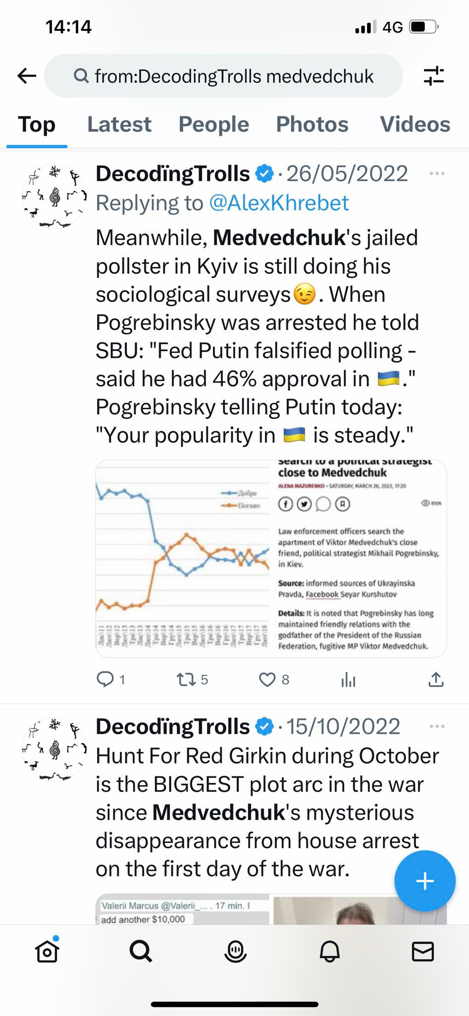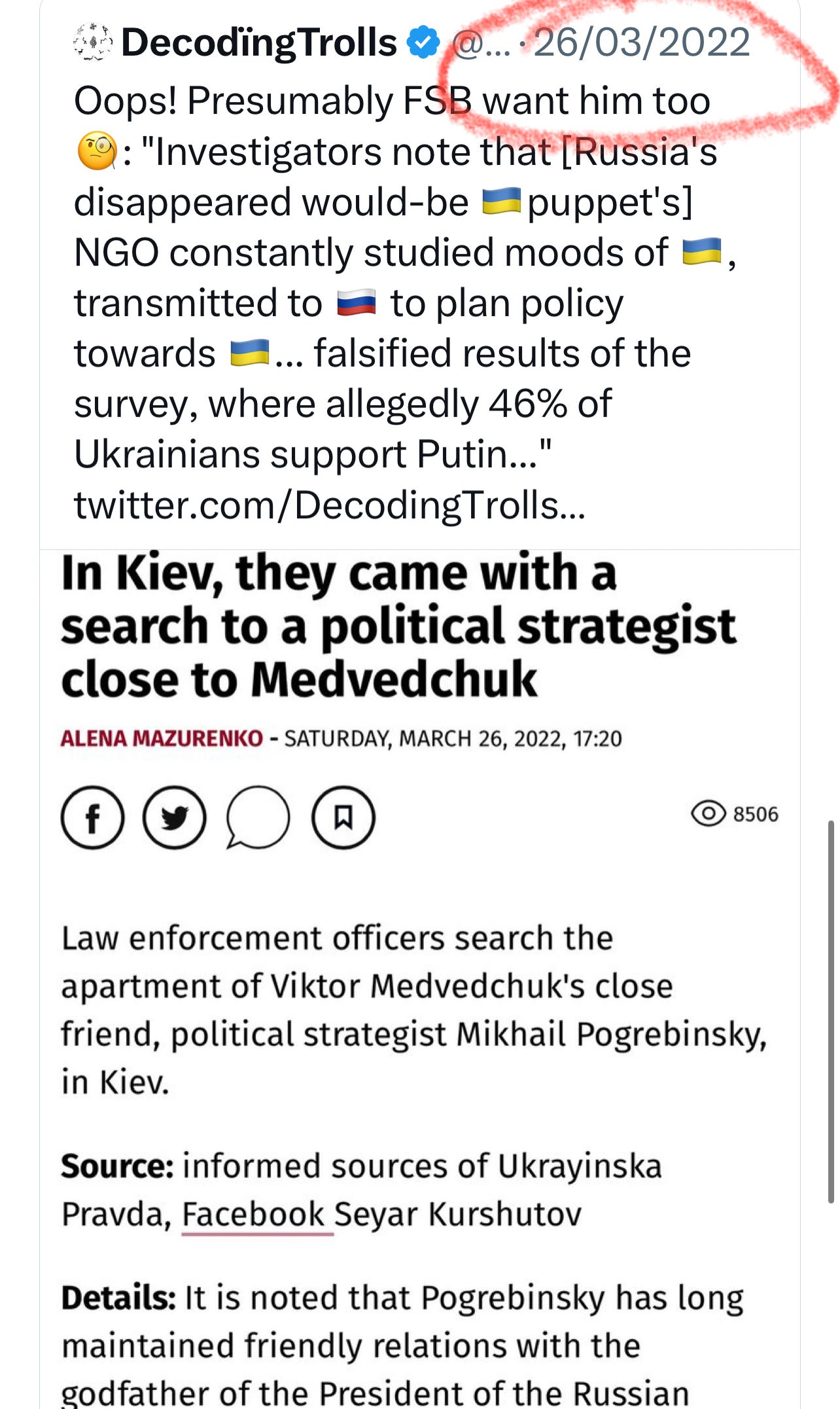 I believe the reason Putin was convinced Ukraine would be a walk in the park is because of this polling. That Putin is in thrall to Medvedchuk is clear: Putin swapped 100+ Azov defenders for Medvedchuk. Putin probably is being told your approval rating in Ukraine is now around 48%.