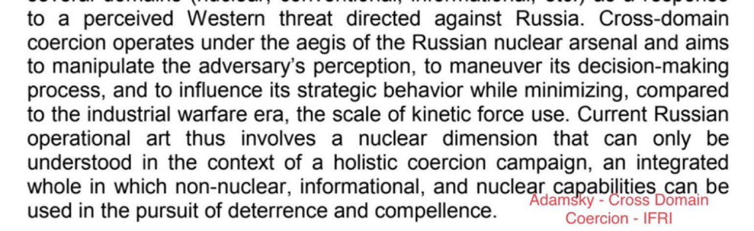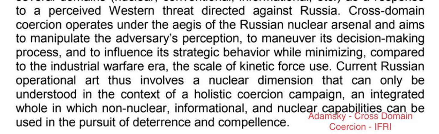 Muscovy’s War Magic doctrine is called “Cross Domain Coercion.” The idea is to get inside your enemies head - say, Germany. Then you persuade Germany that the sky will fall in if Germany agrees to let Ukraine (Germany and Austria murdered millions of Ukrainians between 1941 and 1945) into NATO. Germany falls for the troll. Russian war magic achieves its aims, simply through War Magical means🪄.