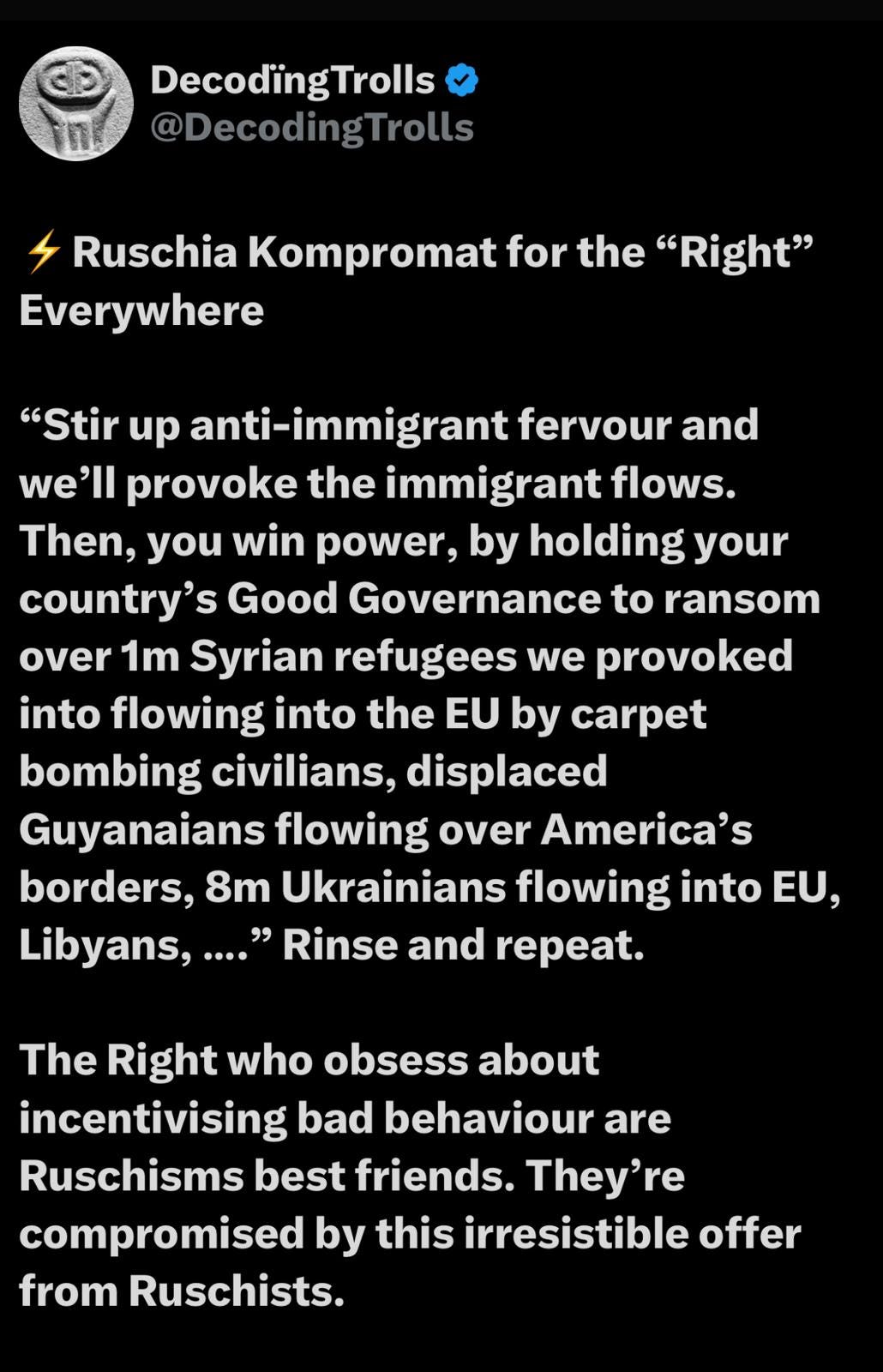 So this migrant othering works like a dream in triggering our desires to be in the Inner Realm. 100% guarantee! And as long as the Right uses immigration to hack brains to win power Ruschia will provoke the migrant flows through indiscriminate bombing. It’s a Closed loop perpetual motion machine powering those self-described Rightists today: