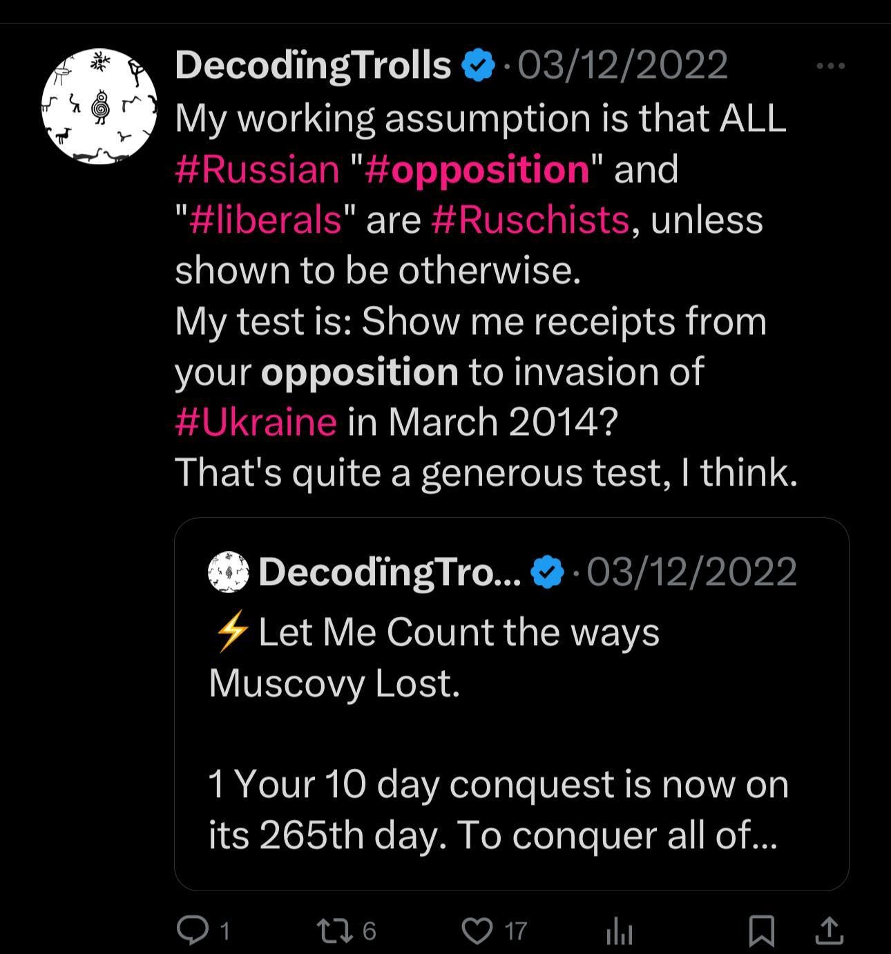 All roads to Ruschism’s defeat run through the killing fields of Ukraine. Focus on platforming Ukrainians, not Ruschia ‘Opposition’ who have zero power to destroy Ruschism (even if they wanted to).