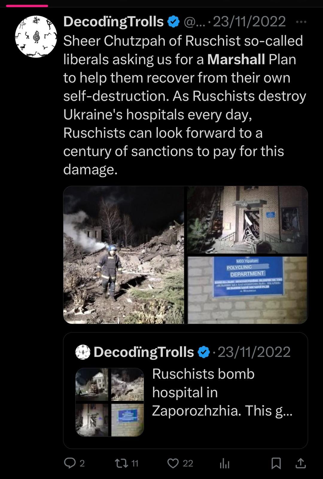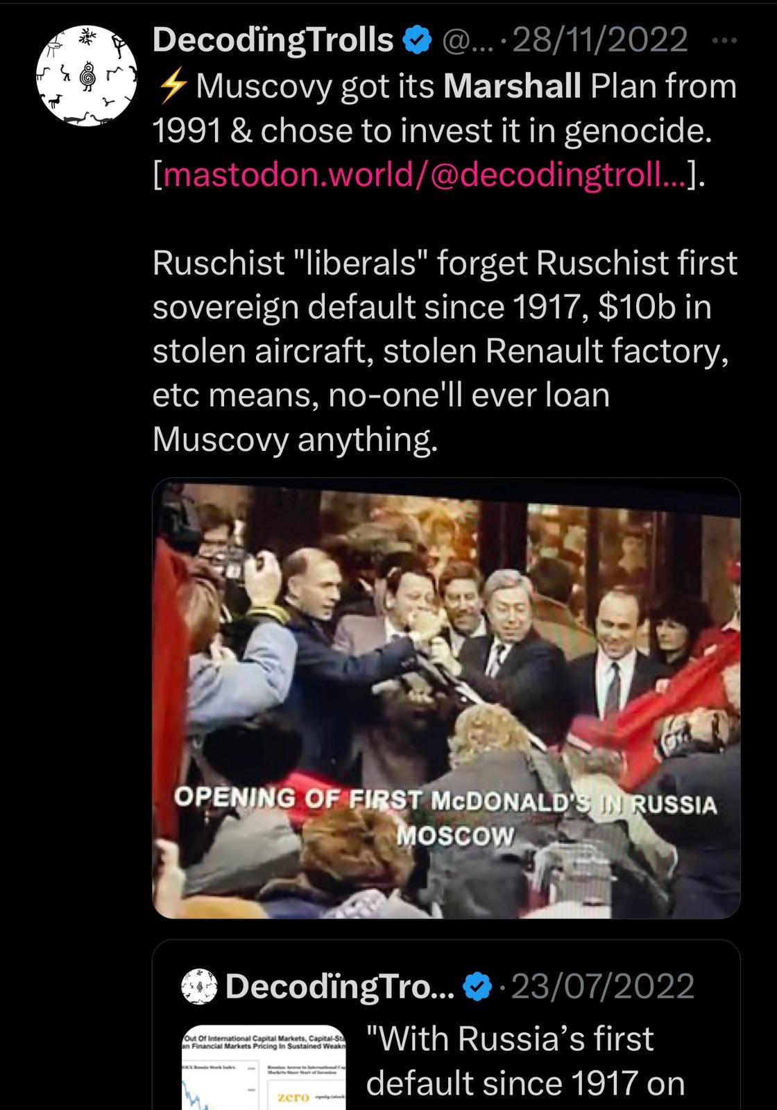 ⚡️"The West" "EU" "LGBTIQ" "gender" "Nazis" "America" "Europe" or "Poland" perform the same function in Ruschist rhetoric today as "international bourgeoisie" did to the Soviets. An Othering as a preparation and justification for a genocide against Ukrainians, & ultimately us.