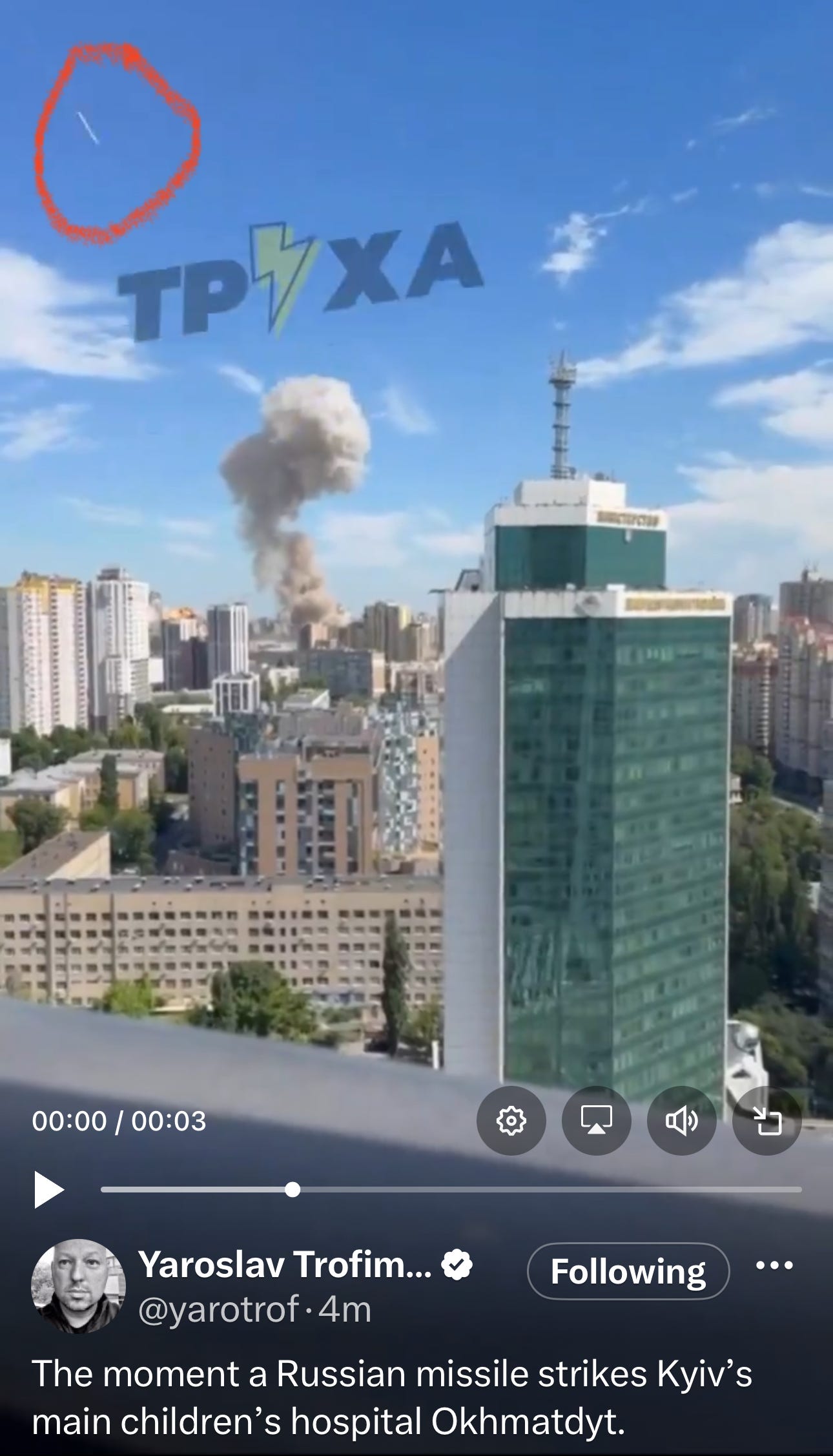 ⚡️Ruschian missile aimed at Kyiv’s main children’s hospital.