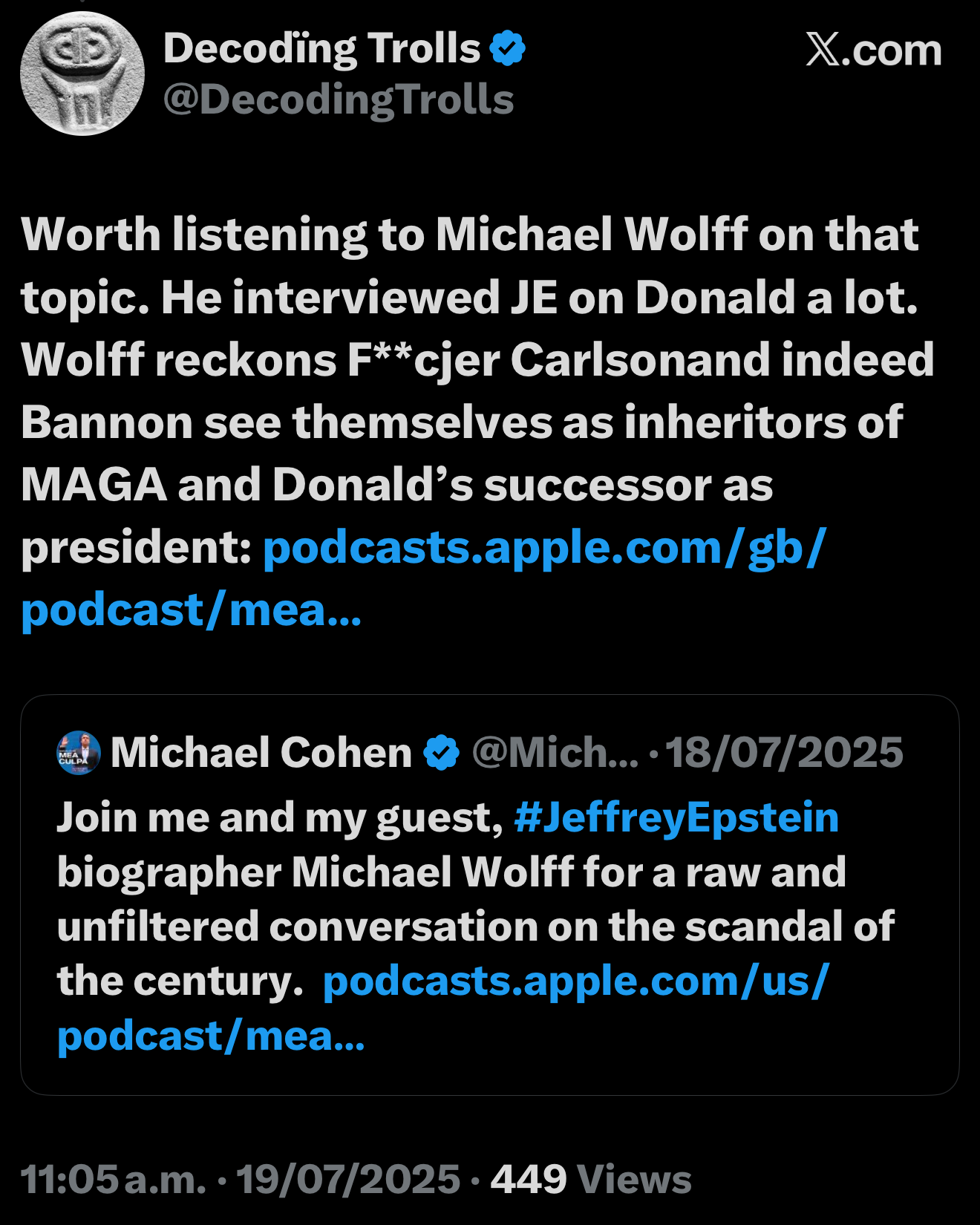 ⚡️Bannon, for whom MTG works/acts, clearly sees Marjorie Taylor Greene as his vehicle to capture the US (vice presidency for himself) presidency for her. Her resignation is the canary in the coal mine and harbinger of doom for Don’s presidency (and so it goes).