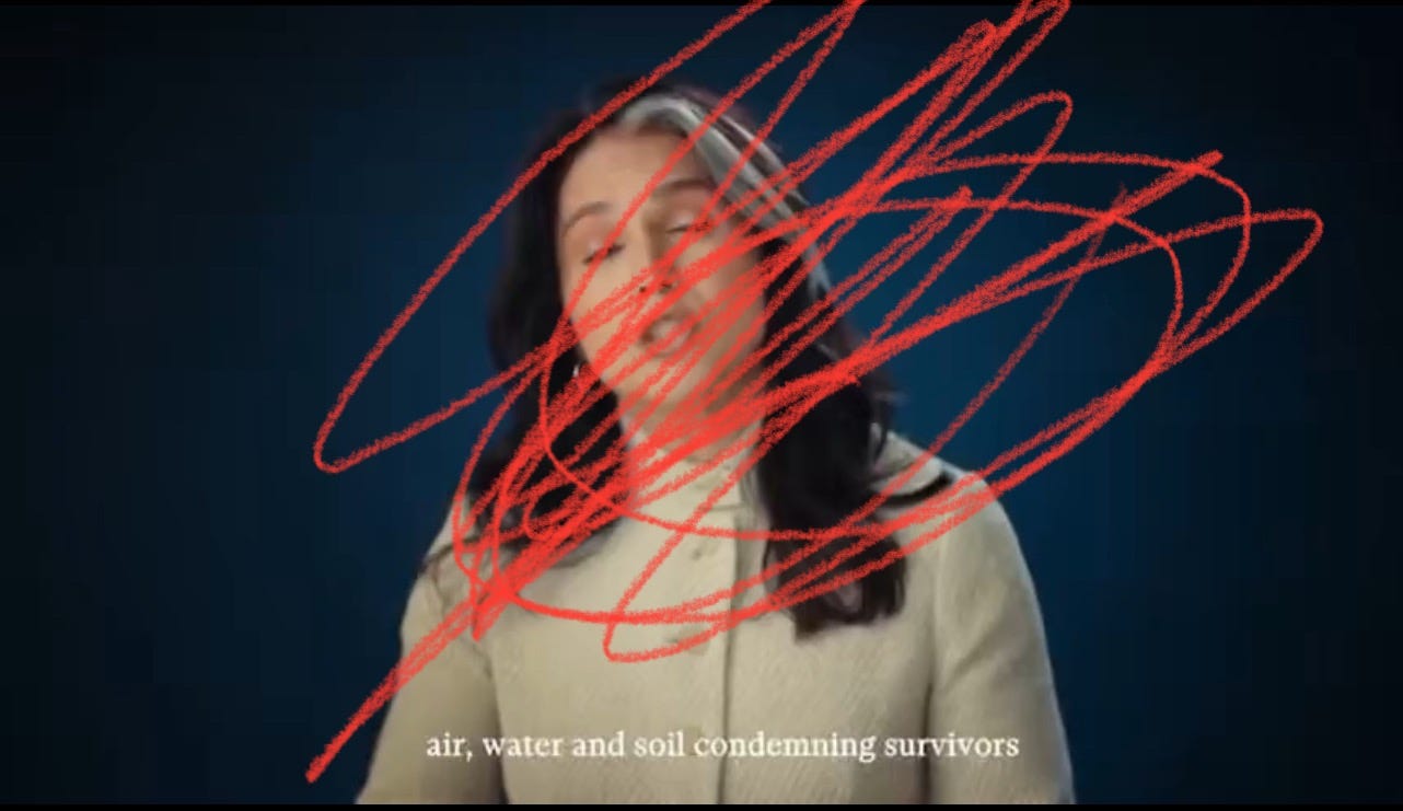 And the aesthetics of Tulsi’s video reminded me of this because what it did was just communicate this mood of darkness, like being in the forest, of just feeling “off.” And it’s so cynically and carefully produced, even her hair. I haven’t paid much attention to her because I do try and control who enters my mind. So this is, in fact, the first time I’ve probably ever watched anything consciously by her. But to see this grey hair strand, which is kind of reminiscent of The Munsters—it’s deliberate archetyping as a witch, as a witch. To put us in that space, our minds in this negative space. And then, of course, the imagery which is flashed up. So her background in terms of the aesthetics, the darkness, and then the imagery of the ashes.
