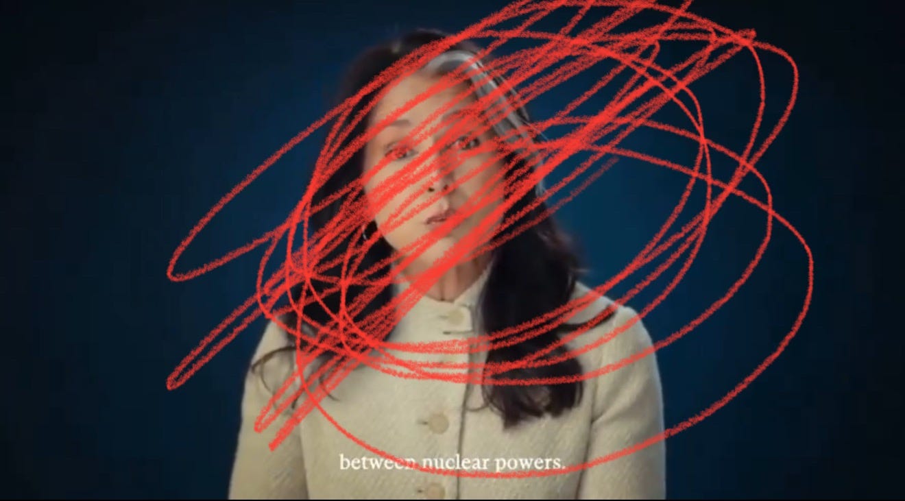 The Incoming/Outgoing Troll Radars, which is the second tool. So that, obviously, when you’re on Twitter, should always be switched on, because everything there could be a troll; it could be there to affect our emotions and hack our rational thought processes. But the overall idea that it communicates is fear and this negative mood which has the power to overcome our radars, so that we allow this in—even just wondering, “Why is she talking about nuclear ashes?” And it goes into our inner mind, and we start getting worried. And this triggers different thought routines which we have and traumas which we have. And these are being deliberately provoked by the aesthetics, by the mood, by the words, by her expression, by the strangeness of this coming from the head of—what is it, 16 national intelligence agencies?—the United States. So this is as “inner realm” as you get, as Deep State as you get. And here she is archetyping herself as not part of the elite, which she says has nuclear bomb shelters and therefore is trying to spark a nuclear war. Which obviously itself is a nonsense, because just because you’ve got a shelter doesn’t mean necessarily you’re going to spark a war.