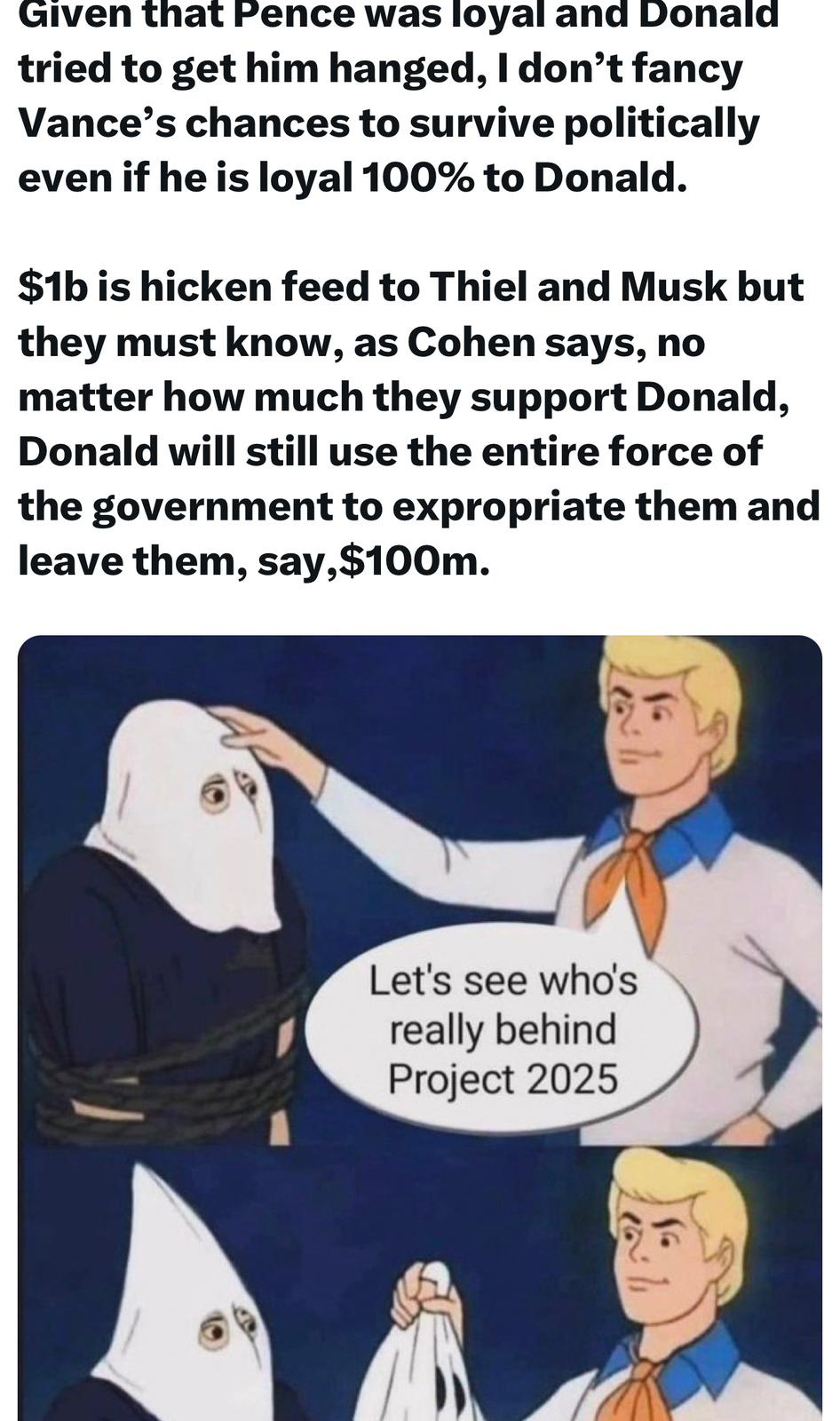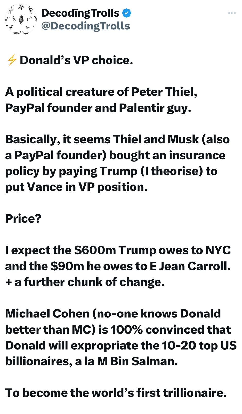 Then Sorcerer Donald was convinced by Sorcerer Thiel and Musk to take on their Apprentice Magus Vance, in return for immunity, and $1b+ - a true Devils’ bargain:
