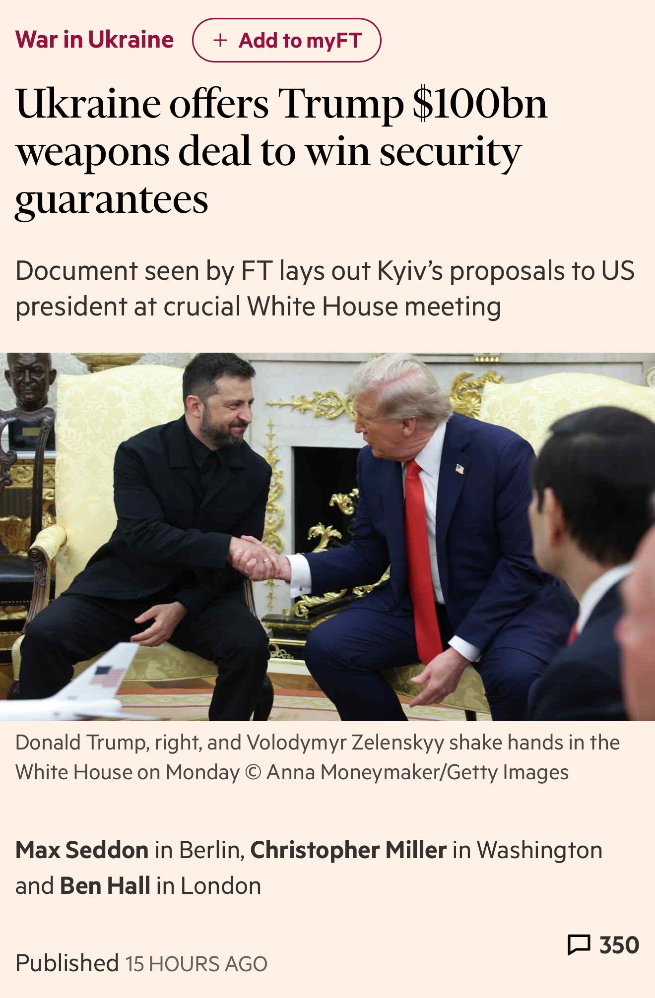 That Ukraine will commit to buying 100 billion in US arms is a fantastic rhetorical way of persuading America that it's getting a great deal by letting Ukraine buy these Patriot missile systems, which no one else can make, and whatever else they can get out of Ukraine.