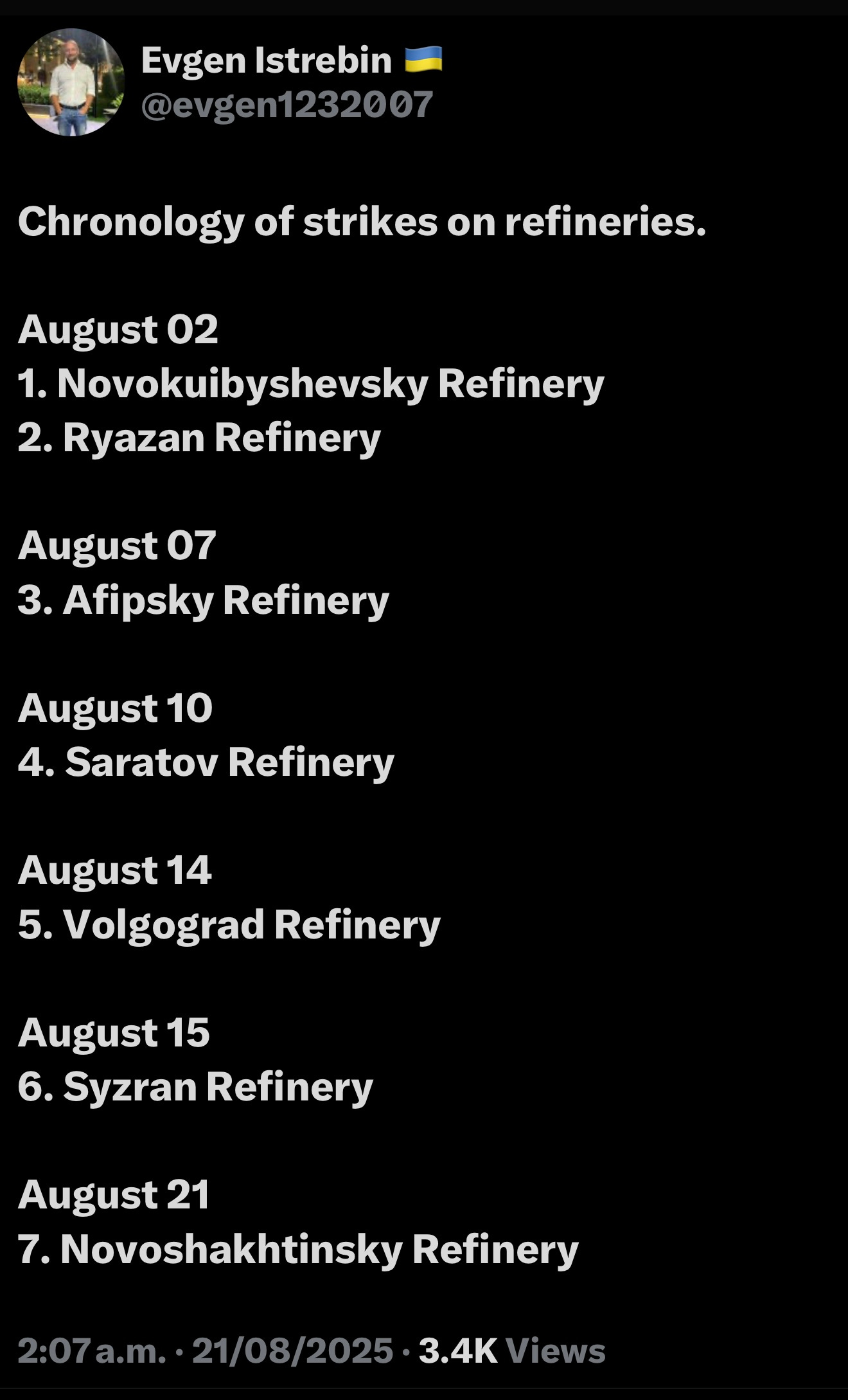 Since late March 2025 America was preventing Ukraine from striking Russia’s fossil fuel infrastructure due to the ‘peace process’…